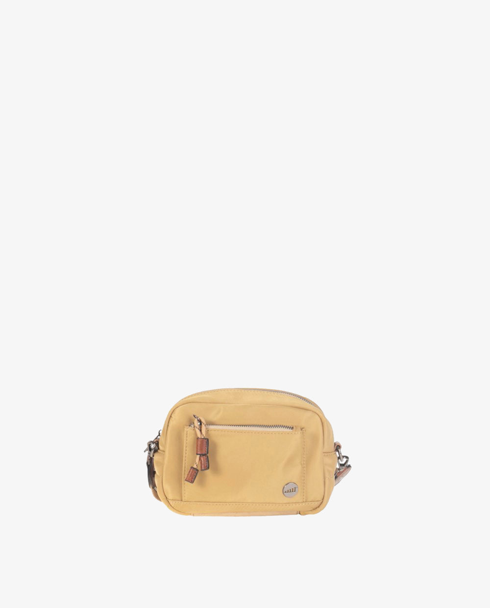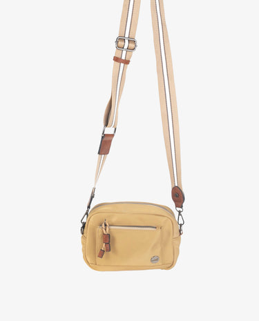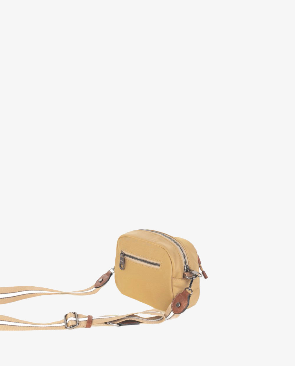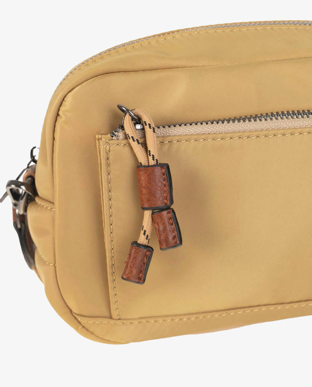 Bolso bandolera de nylon color bisonte práctico y ligero por su bolsillo frontal con cremallera metálica y tirador de cuerda combinado en pu cuero al igual que el asa bandolera de cuerda combinada en pu cuero. Los fuelles de este modelo con el detalle acolchado enriquece el look de esta bandolera. Parte frontal con logo metálico volum más la parte trasera con cremallera metálica al tono.