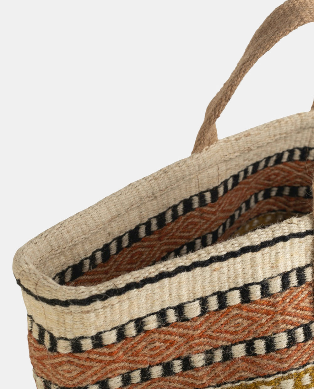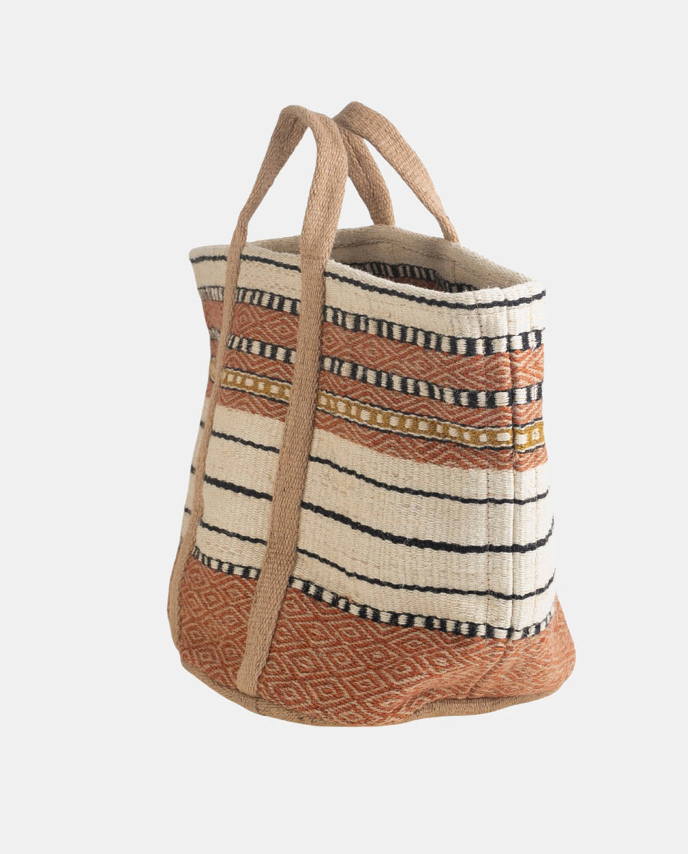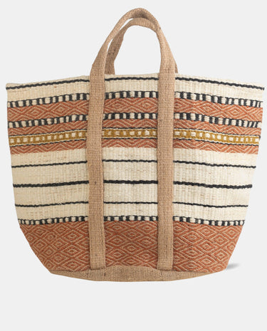 Este modelo está disponible en un tono natural de yute y cuenta con un estampado étnico que le aporta un toque único. Además de ser práctico, se adapta a diversas ocasiones gracias a su versatilidad: perfecto para hacer la compra, disfrutar de un día de playa o decorar tu hogar.