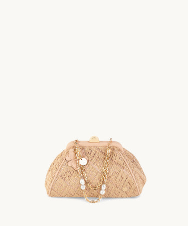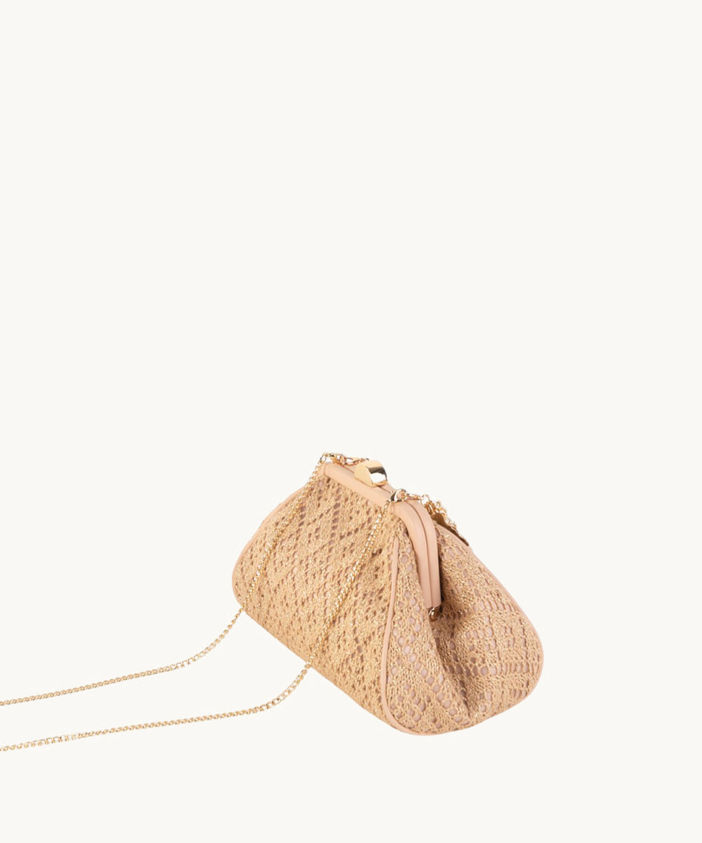 El bolso se presenta en un atractivo color nude, un tono neutro que se adapta fácilmente a diversas combinaciones de ropa. Su forma estructurada recuerda a los bolsos de mano clásicos, complementado con un cierre en la parte superior que evoca un estilo vintage.