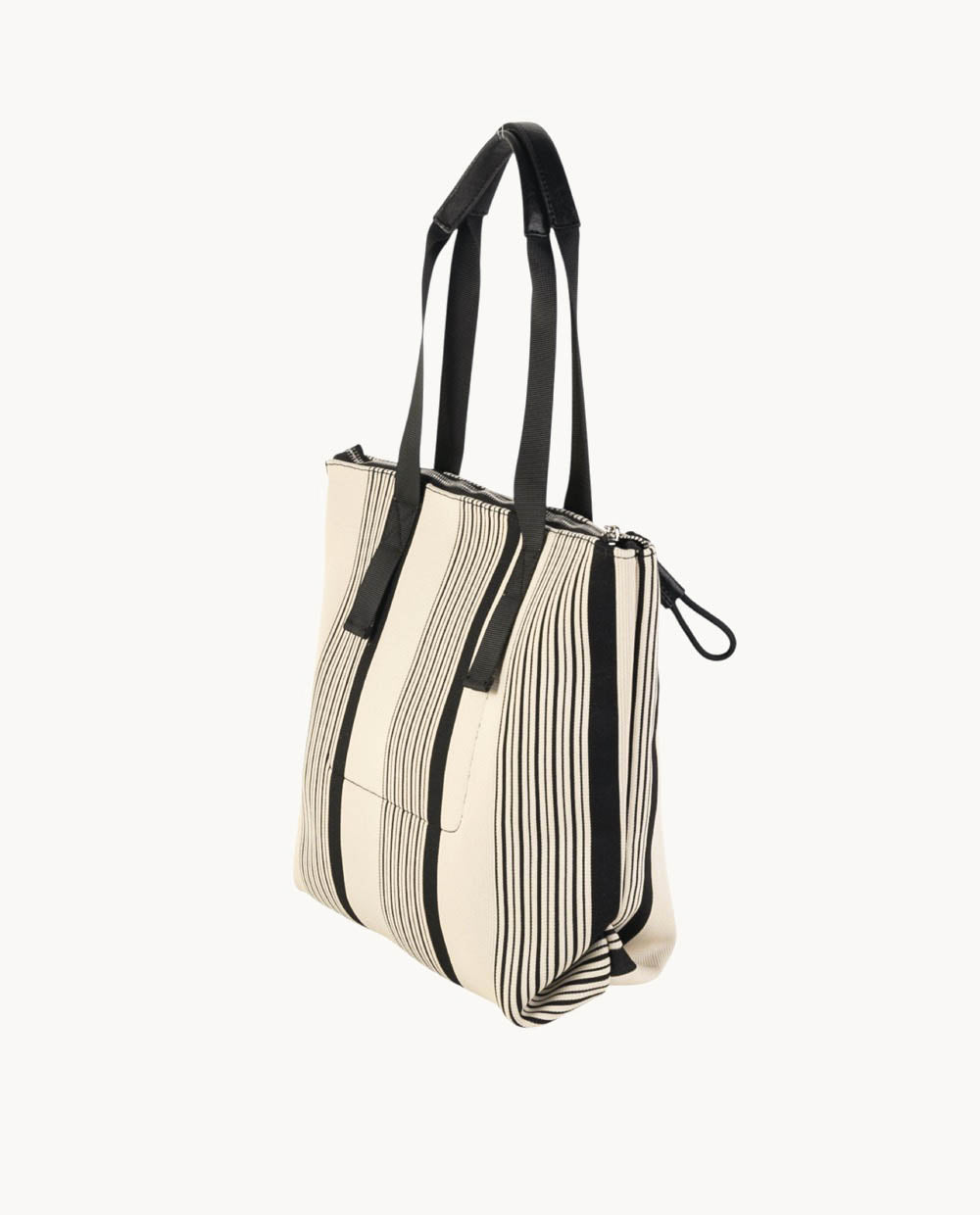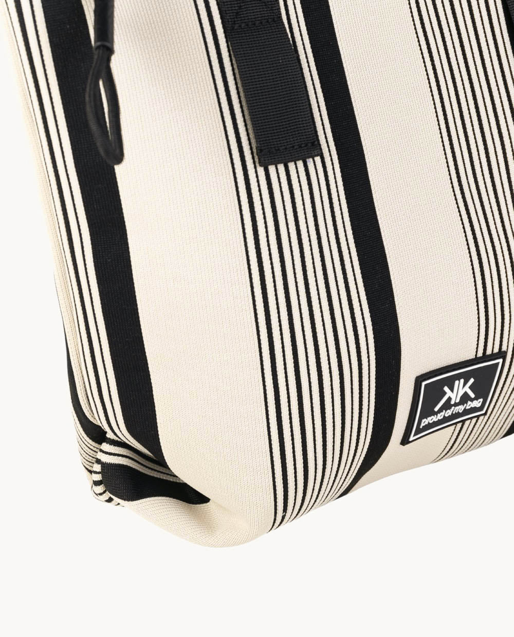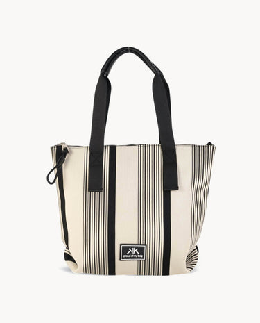Este tote está fabricado en algodón, lo que le proporciona una textura suave y duradera. Su diseño en blanco con rayas negras le otorga un aspecto moderno y elegante. La cremallera en la parte superior asegura que tus pertenencias estén protegidas y a salvo.