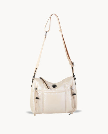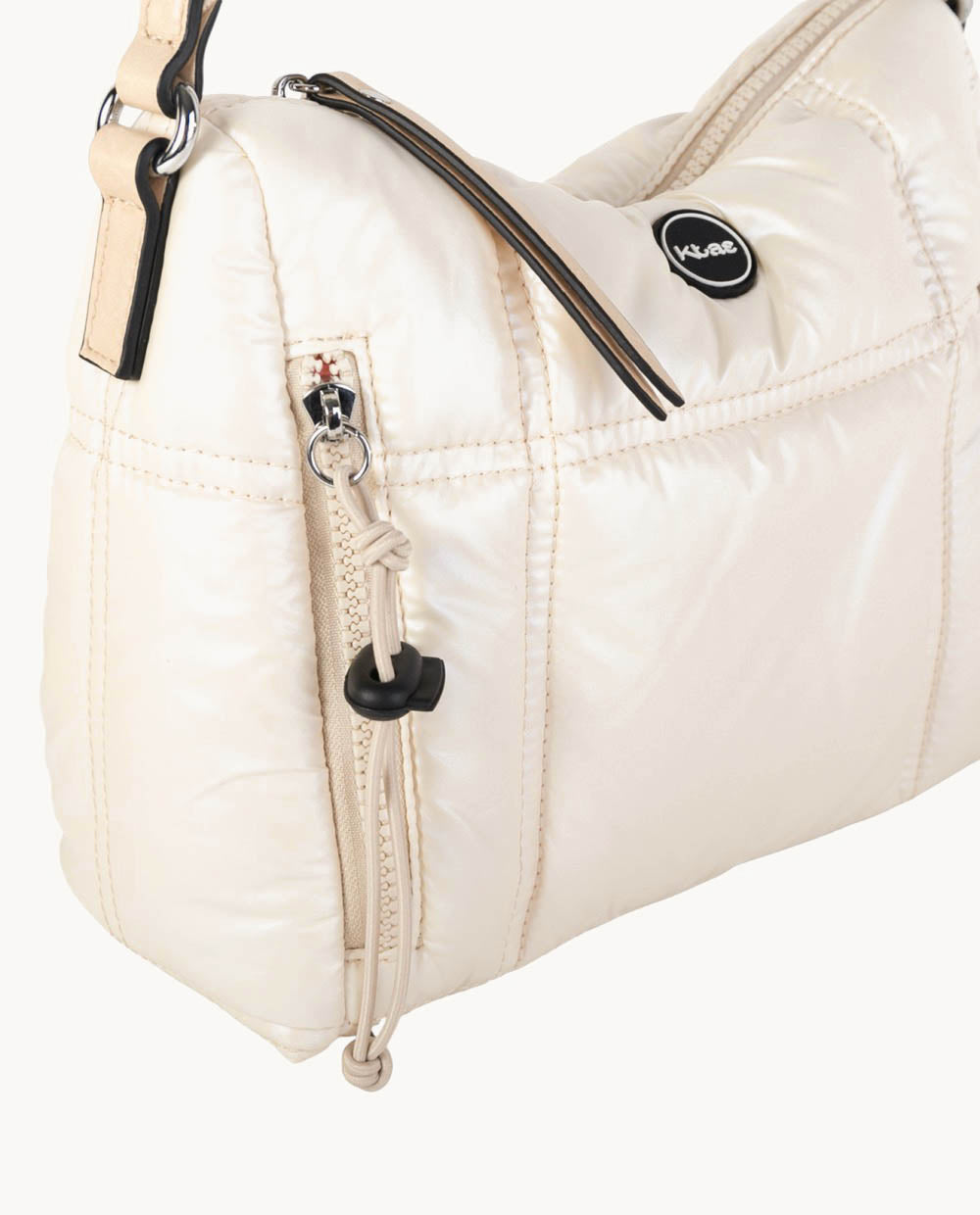 Este modelo está fabricado en nylon, un material que combina ligereza y resistencia, lo que garantiza durabilidad en su uso diario. El color marfil es un tono neutro que se adapta fácilmente a diversas prendas, convirtiéndola en una opción versátil para cualquier ocasión.