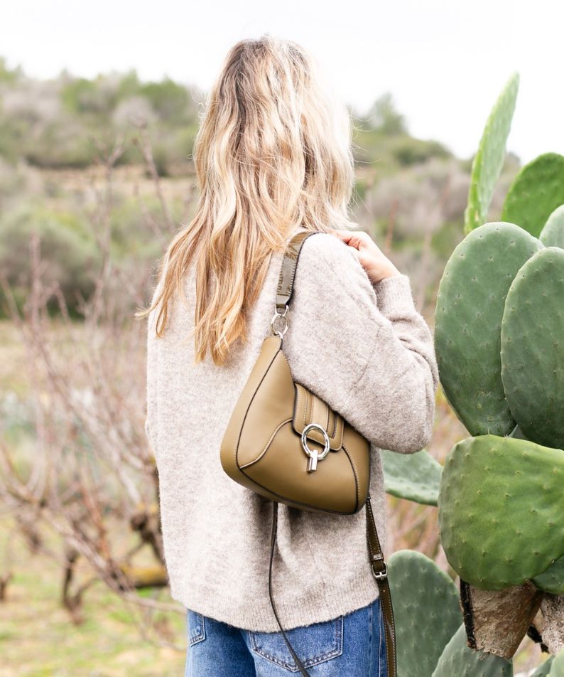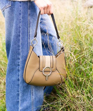Con un diseño moderno y estructurado, este bolso presenta un color taupe, un tono neutro que se adapta a una variedad de atuendos. Su forma incluye un detalle circular en la parte frontal y una solapa con costuras verticales, lo que le confiere un aspecto sofisticado.
