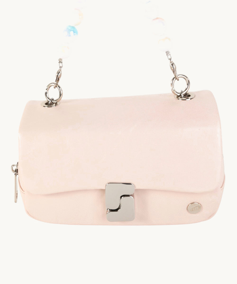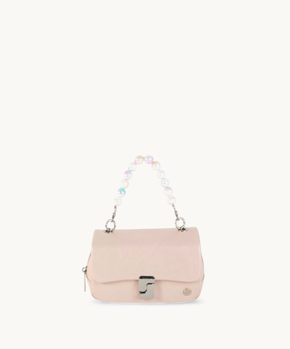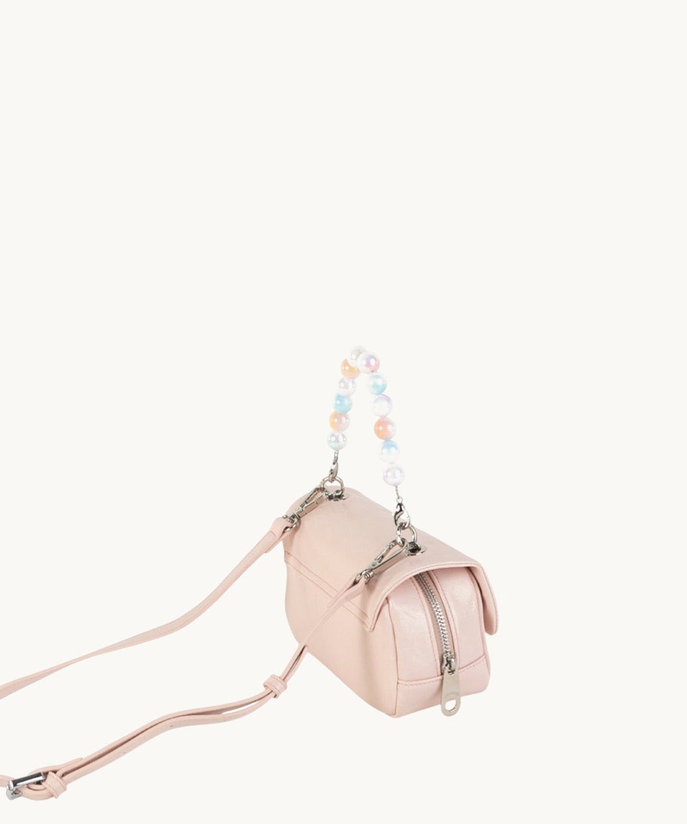 Con unas medidas de 18 cm de largo, 8 cm de ancho y 11 cm de alto, su forma rectangular y compacta es perfecta para llevar lo esencial. Además, cuenta con un asa corta decorativa compuesta de cuentas en tonos pastel, que añade un toque divertido y juvenil al diseño. Incluye también una correa adicional que permite llevarlo al hombro, brindando mayor comodidad.