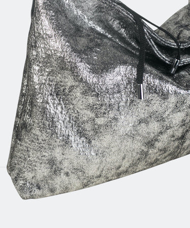 Este elegante bolso tipo hobo está confeccionado en poliuretano (PU) de alta calidad, lo que le otorga un acabado metálico brillante en un atractivo color plata. Su diseño hobo se caracteriza por su forma suave y curvilínea, que se adapta cómodamente al cuerpo, ofreciendo tanto estilo como funcionalidad.