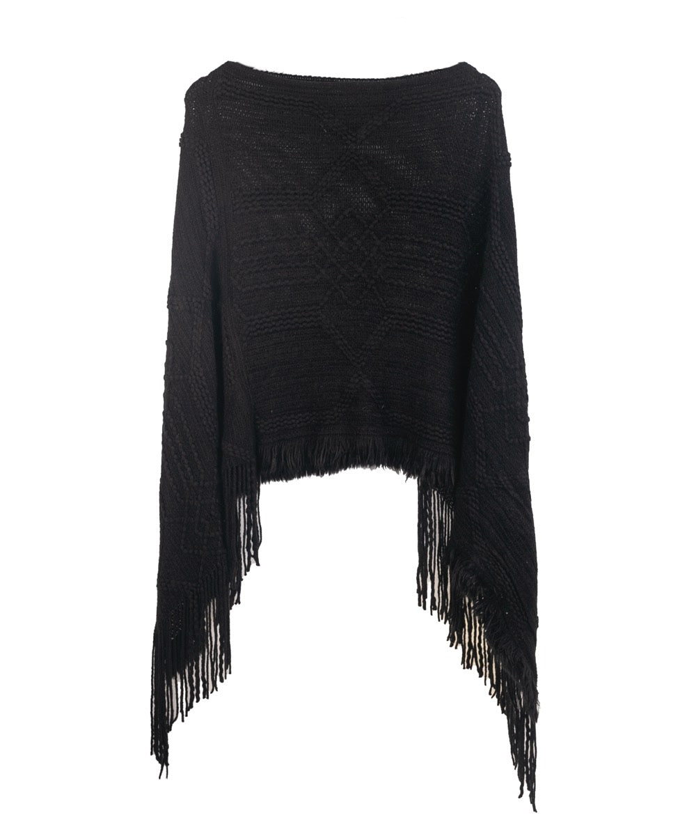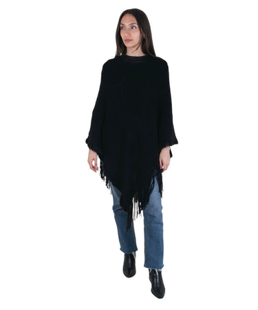 El poncho de lana sintética en color negro es una prenda elegante y versátil, ideal para diversas ocasiones. Su color clásico permite combinarlo fácilmente con diferentes estilos y prendas.