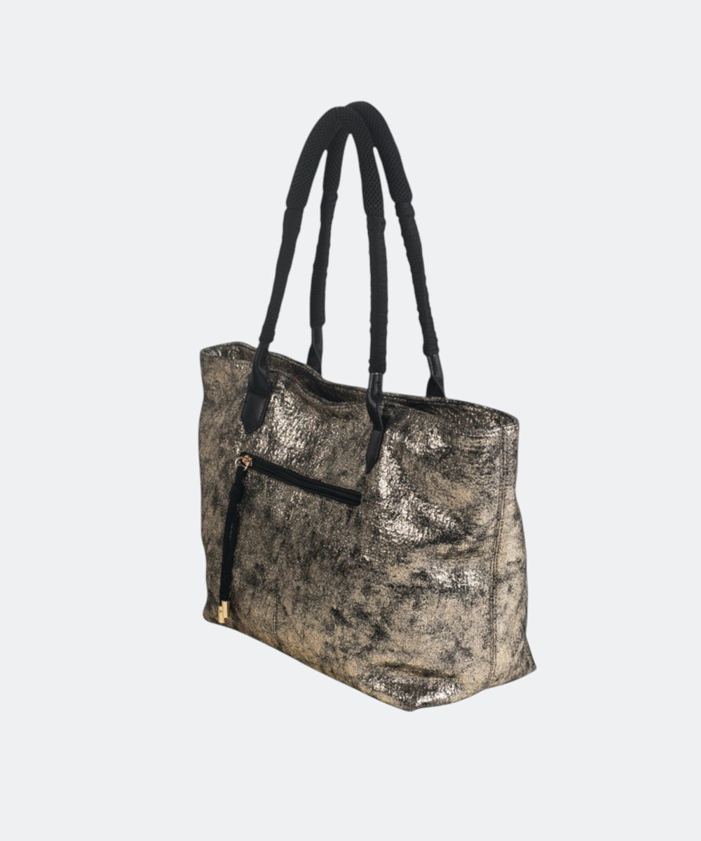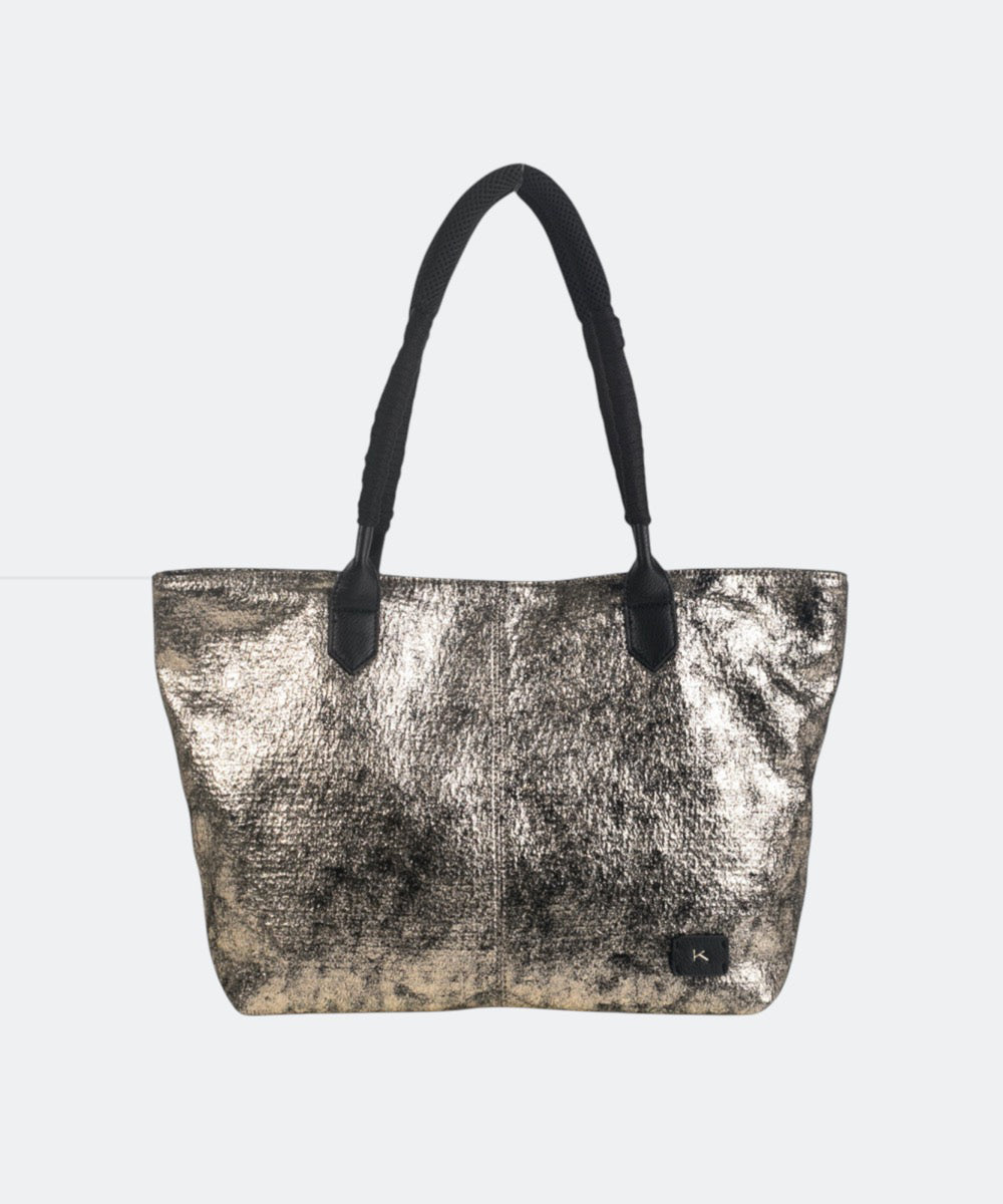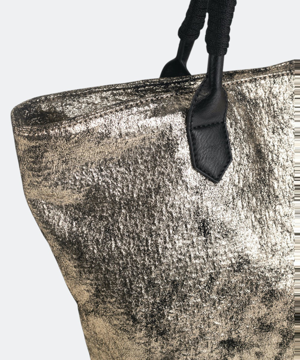 Este bolso de compras está confeccionado en material PU metalizado, presentando un acabado brillante en color oro. Este tipo de material es reconocido por su durabilidad y resistencia, además de brindar un aspecto elegante y moderno.