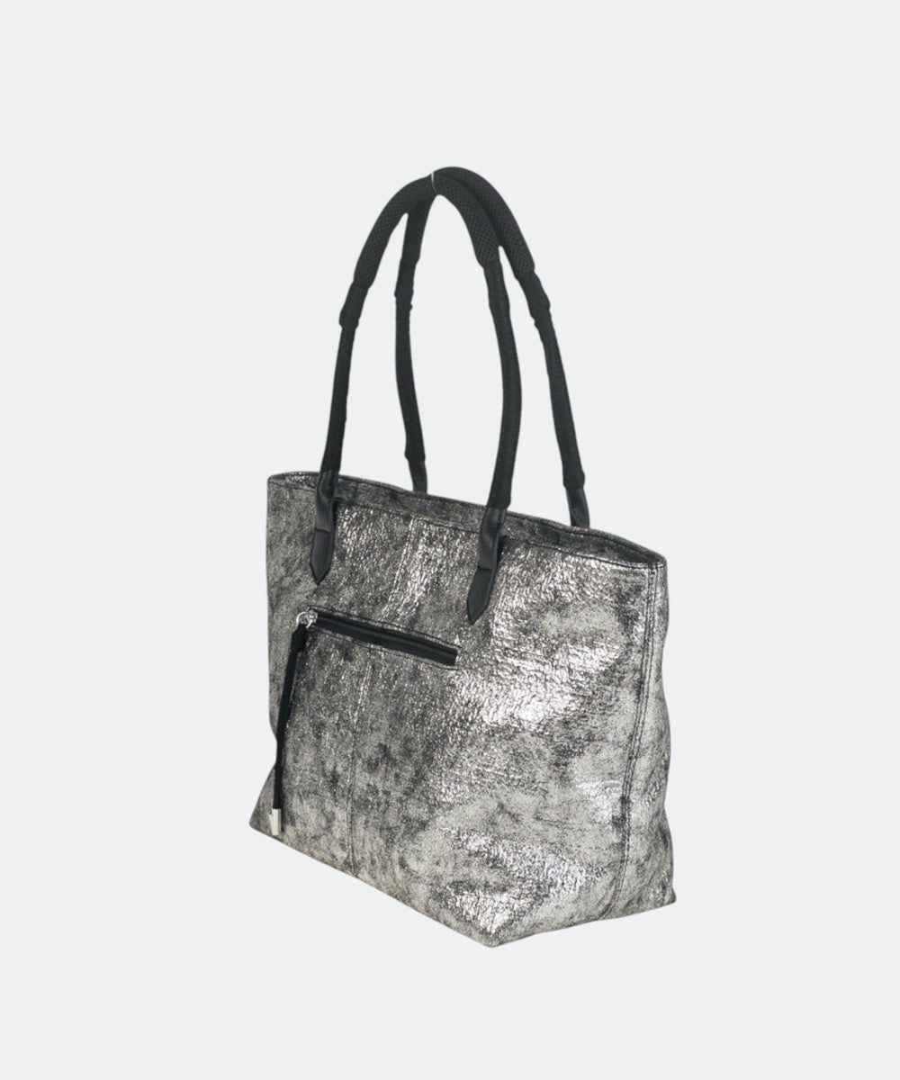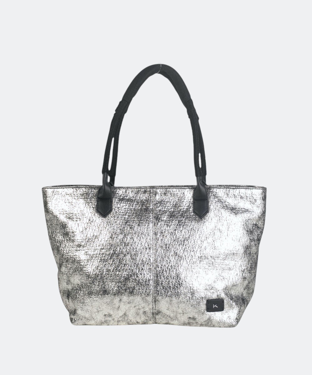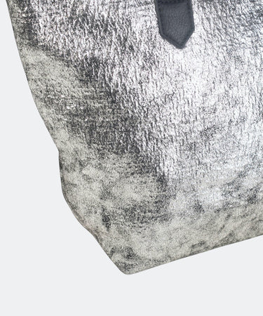 El SHOPPING PU METALIZADO en color plata es el accesorio ideal para quienes buscan un toque moderno y llamativo en su estilo. Con un acabado brillante, este bolso destaca por su diseño elegante y contemporáneo, perfecto para cualquier ocasión.