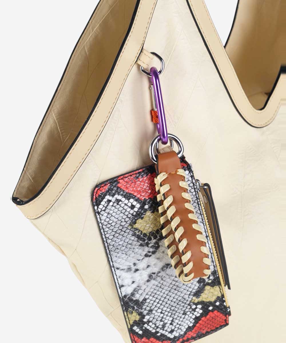 Bolso de hombro de dos asas en forma de capazo alargado vertical con curva en la base dandole una silueta veraniega, ligera y distinguida. Dicho modelo está confeccionado en pu grabado de tacto agradable y blando el cual hace de el que sea muy práctico y comodo de llevar. Consta de cremalleta metálica en la parte trasera más en la apertura principal, en la cual por su sistema puede transformarse en una bolsa. En la parte frontal consta de tassel con accesorio de monedero en pu de animal print de serpiente más tassel en pasamaneria y mosqueton XL en color. Total look fresco y muy veraniego.