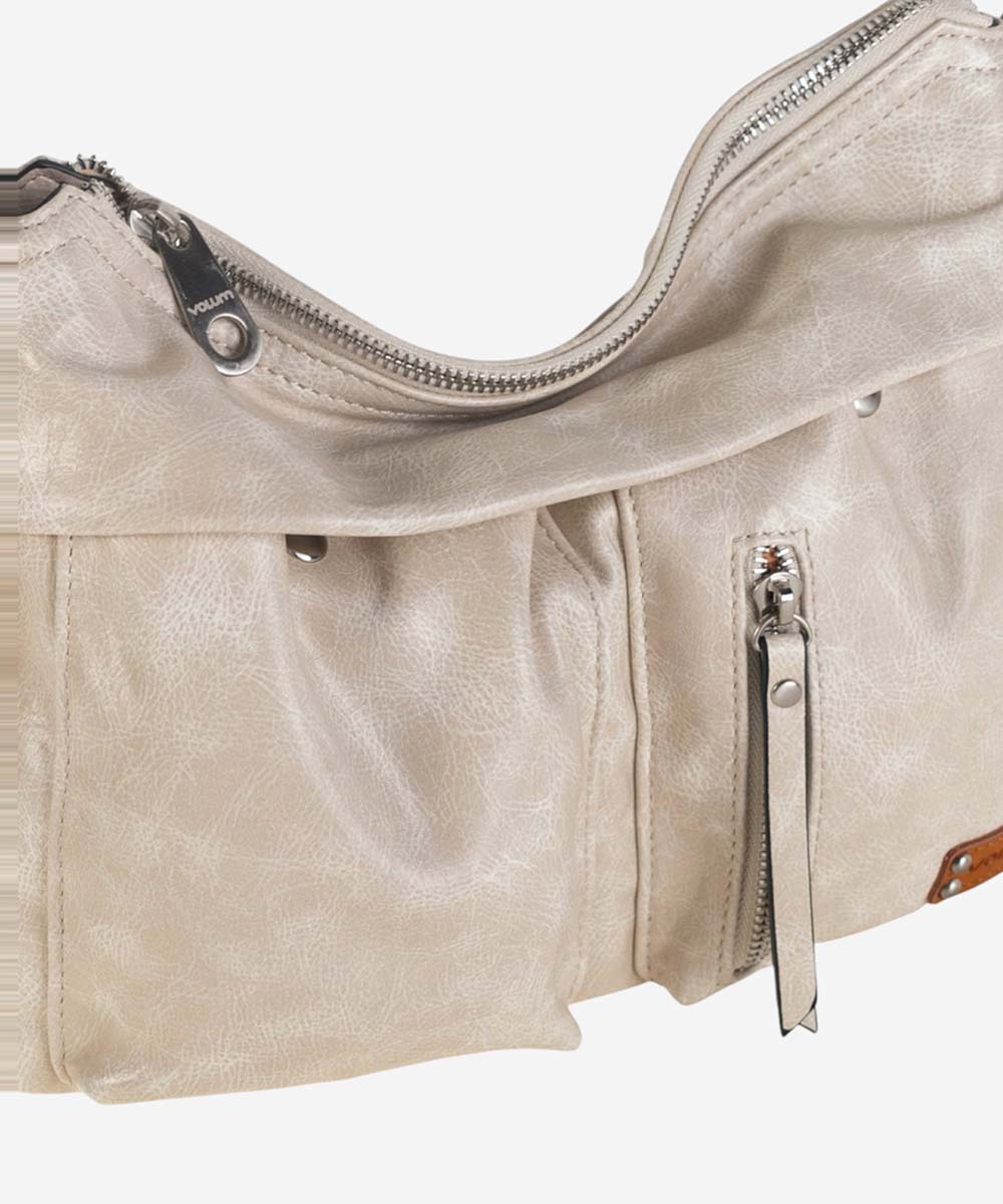 Bolso bandolera confeccionadao en pu color marfil con acabado lavado dando un efecto muy real de piel por el aspecto y el tacto .Bandolera de tamaño medio muy funcional por los bolsillos de la parte frontal, esta con cierre de iman mas uno de ellos con cremallera metalica en vertical aportando mas funcionalidad, dicho bolsillo con el logo volum grabado en contraste sobre pu cuero con detalles en remaches, dando un aspecto mas casual y fresco para el verano. Parte trasera consta de cremallera metalica .