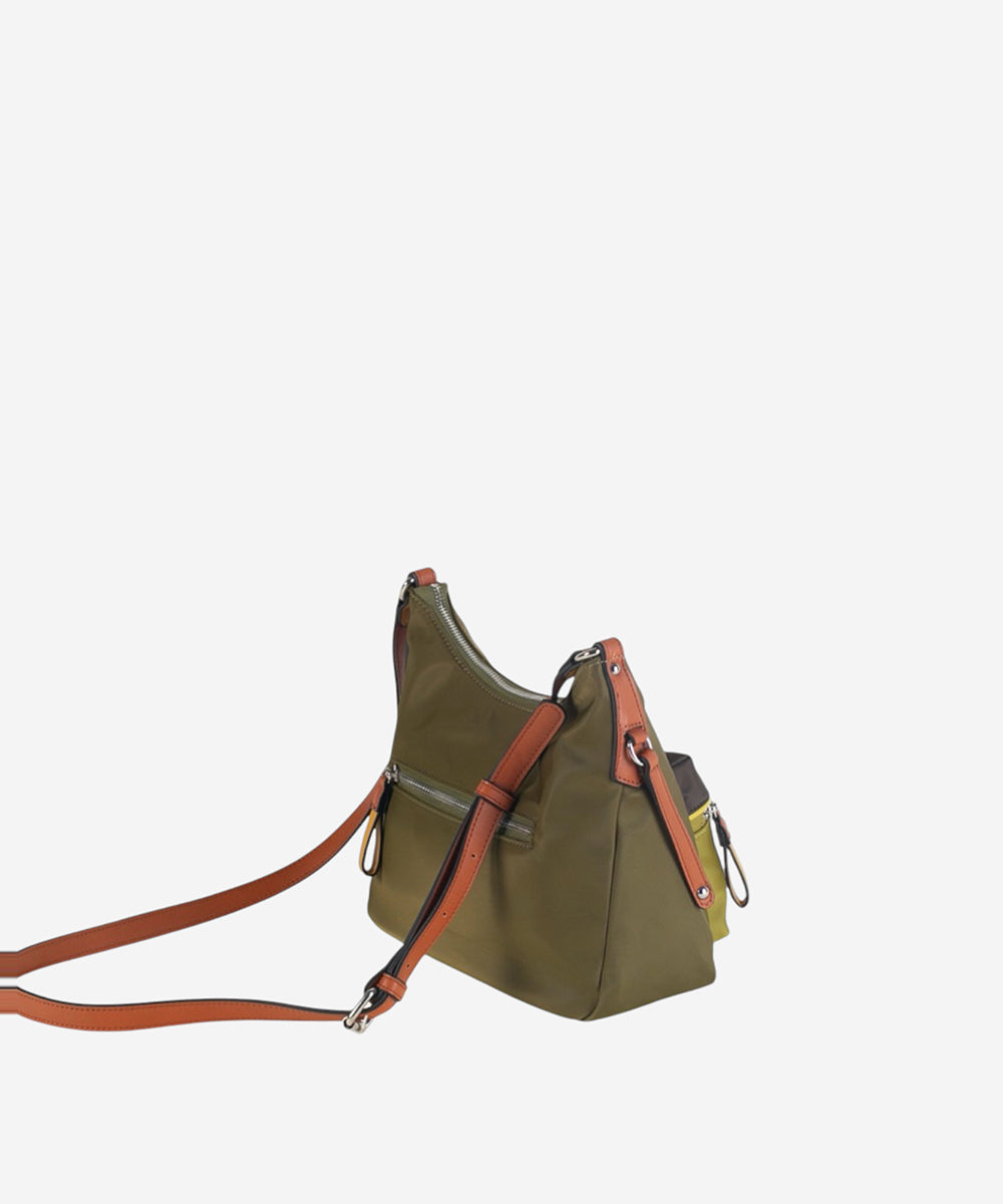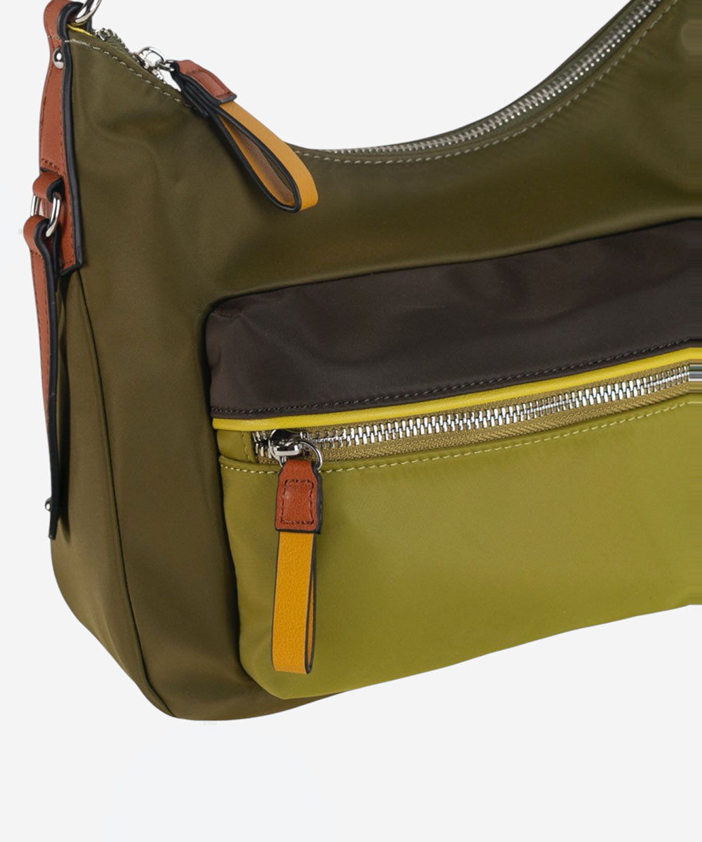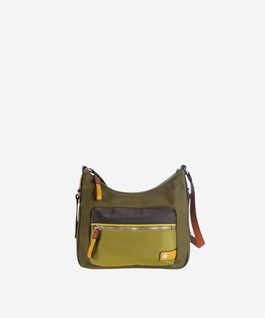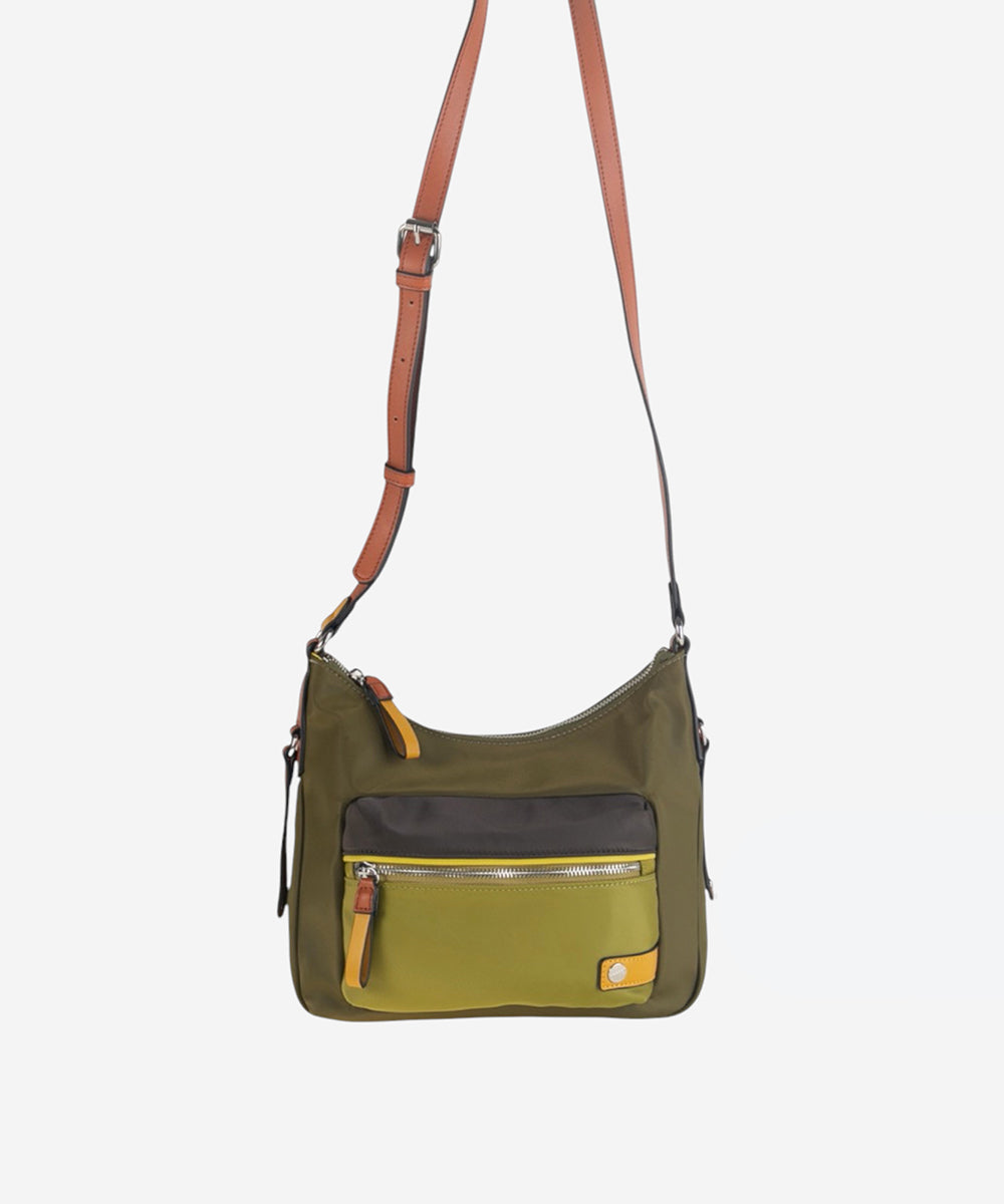 Modelo bandolera de nylon en color kaki combinando asas , detalles de tiradores y logo en cuero y amarillo . Modelo sencillo y practico ya que consta de cremallera metalica en la parte trasera mas la abertura principal y bolsillo en la parte frontal consta de bolsillo con el ribete de la cremallera metalica en contraste aportando el toque de fresco y divertido a la coleccion.