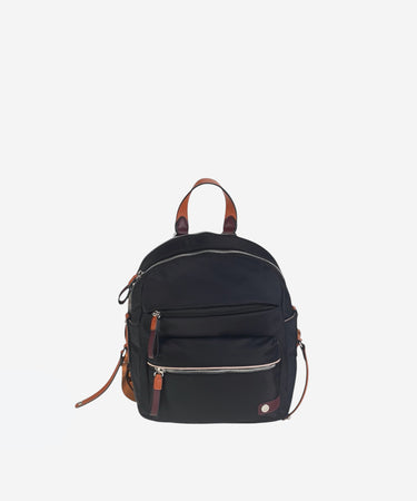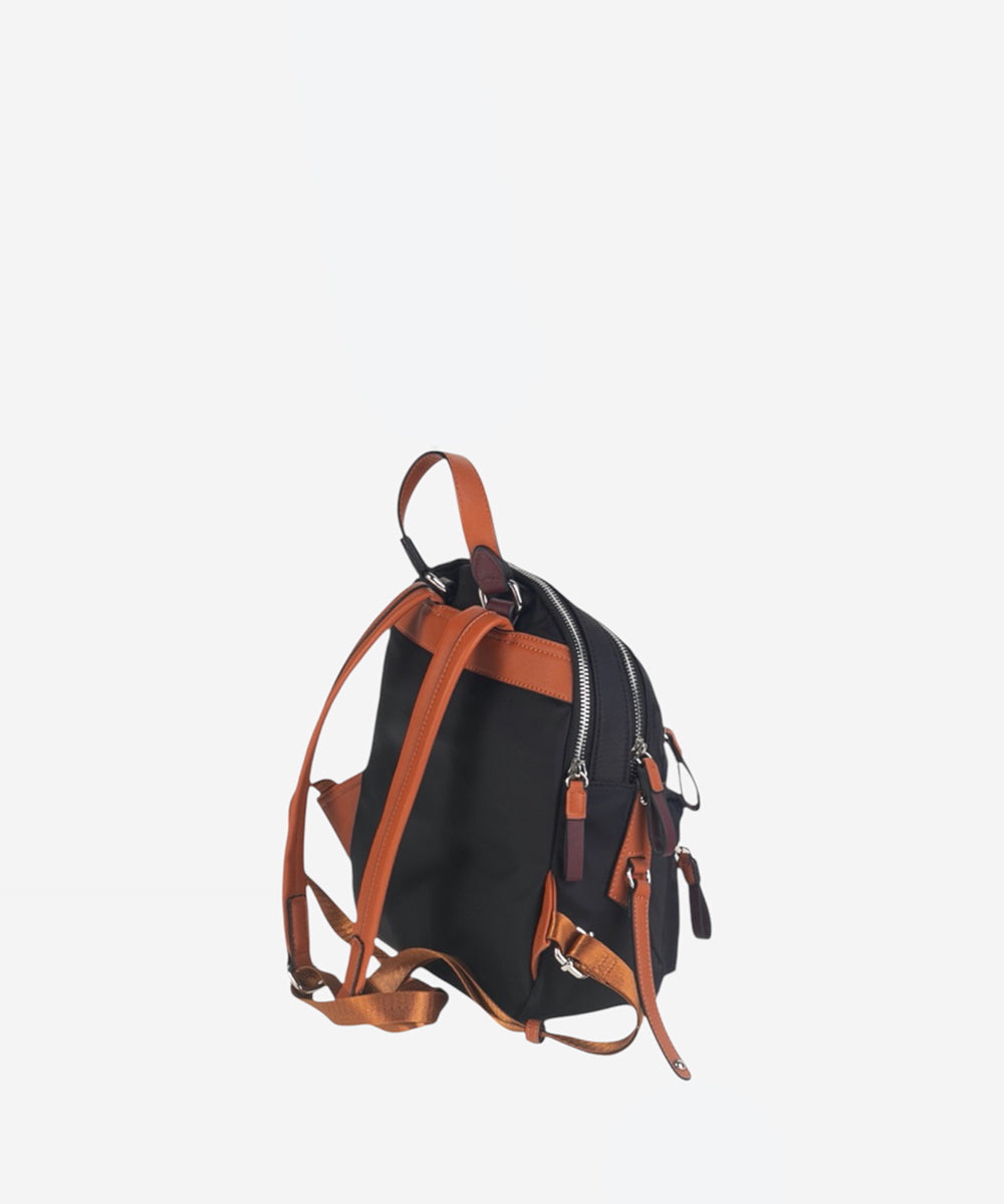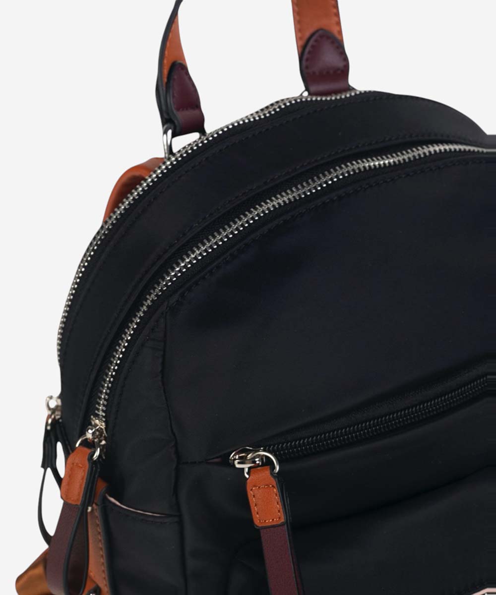 Mochila de nylon color kaki combinada en pu en cuero y detalles de tiradores con un toque de burdeos . Este modelo es muy practico y funcional debido a que consta de dos cremalleras metalicas en la parte superios mas una de nylon en la parte frontal y un bolsillo con cierre de cremallera metalica con ribete en contraste aportando el toque de fresco y divertido a la coleccion.En los laterales consta de dos bolsillo planos con detalles en cuero y anilla metalica .