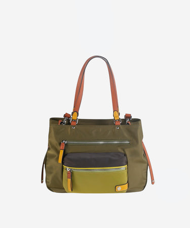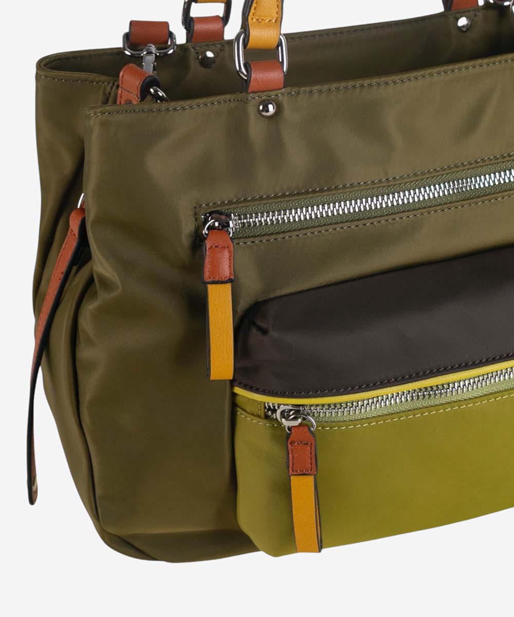 Bolso de hombro de dos asas confeccionado en nylon color kaki .Este modelo muy practico por sus compartimentos en el interior ya que consta de tres , el central con cremallera metalica mas dos con cierre me iman . En el exterior en la parte frontal consta de bolsillo con el ribete de la cremallera metalica en contraste aportando el toque de fresco y divertido a la coleccion . Los tiradores de cremallera que se combian en cuero y color amarillo . Todos estos detalles aportan un look muy juvenil a la coleccion .Las asas de hombro combinadas en cuero al igual que el asa adicional bandolera