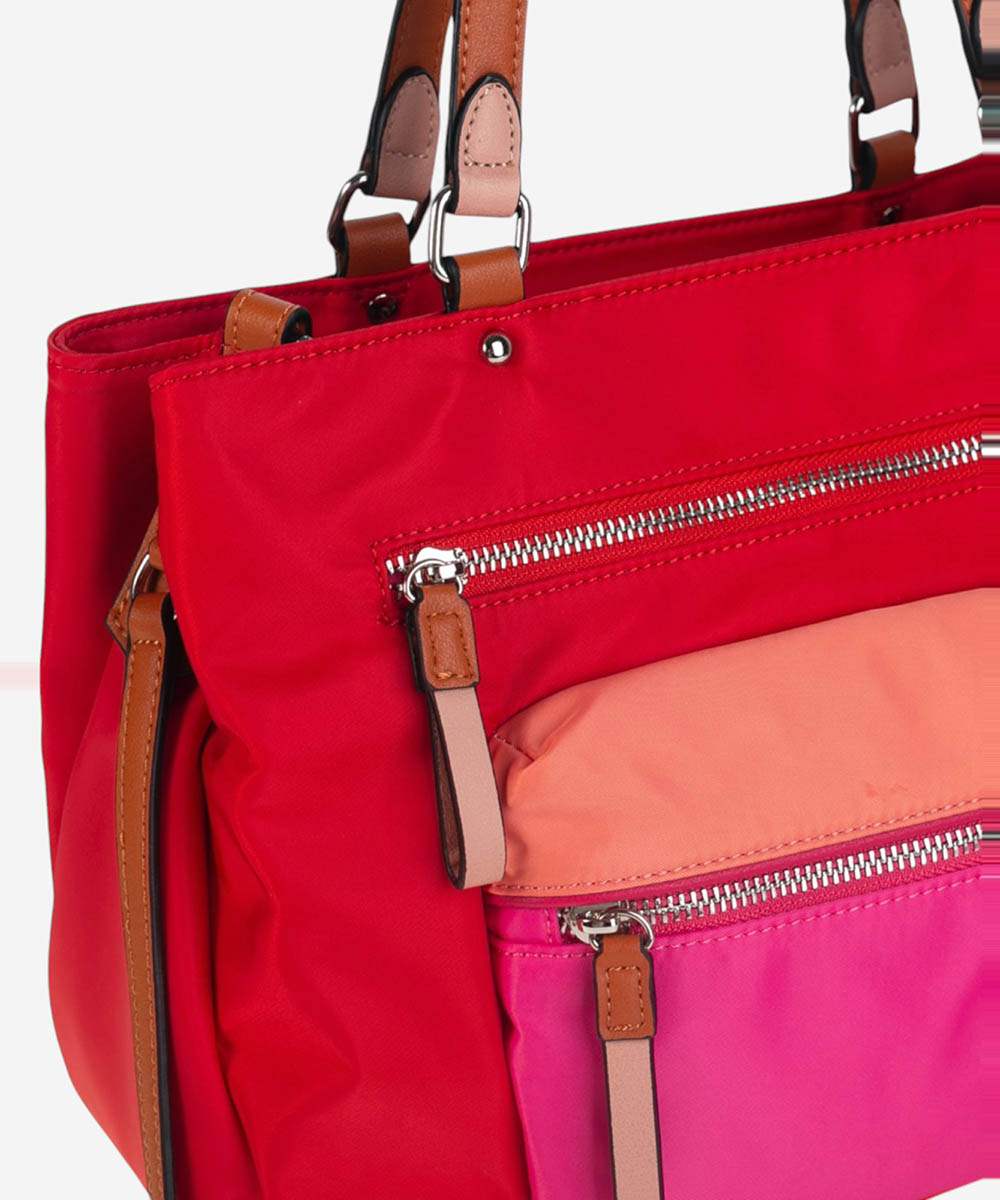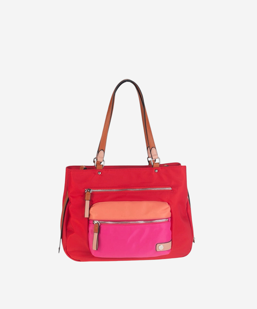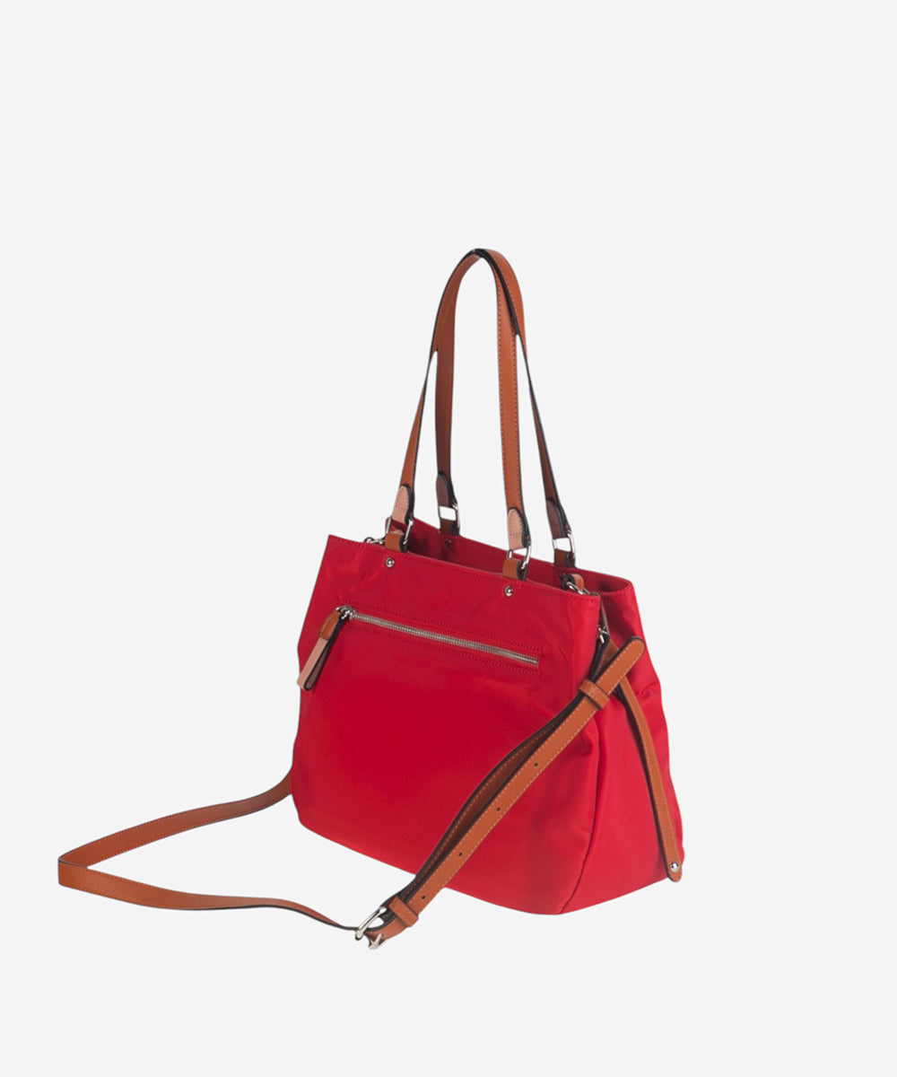 Bolso de hombro de dos asas confeccionado en nylon color rojo .Este modelo muy practico por sus compartimentos en el interior ya que consta de tres , el central con cremallera metalica mas dos con cierre me iman . En el exterior en la parte frontal consta de bolsillo con el ribete de la cremallera metalica en contraste aportando el toque de fresco y divertido a la coleccion . Los tiradores de cremallera que se combian en cuero y color rosa palo . Todos estos detalles aportan un look muy juvenil a la coleccion .Las asas de hombro combinadas en cuero al igual que el asa adicional bandolera