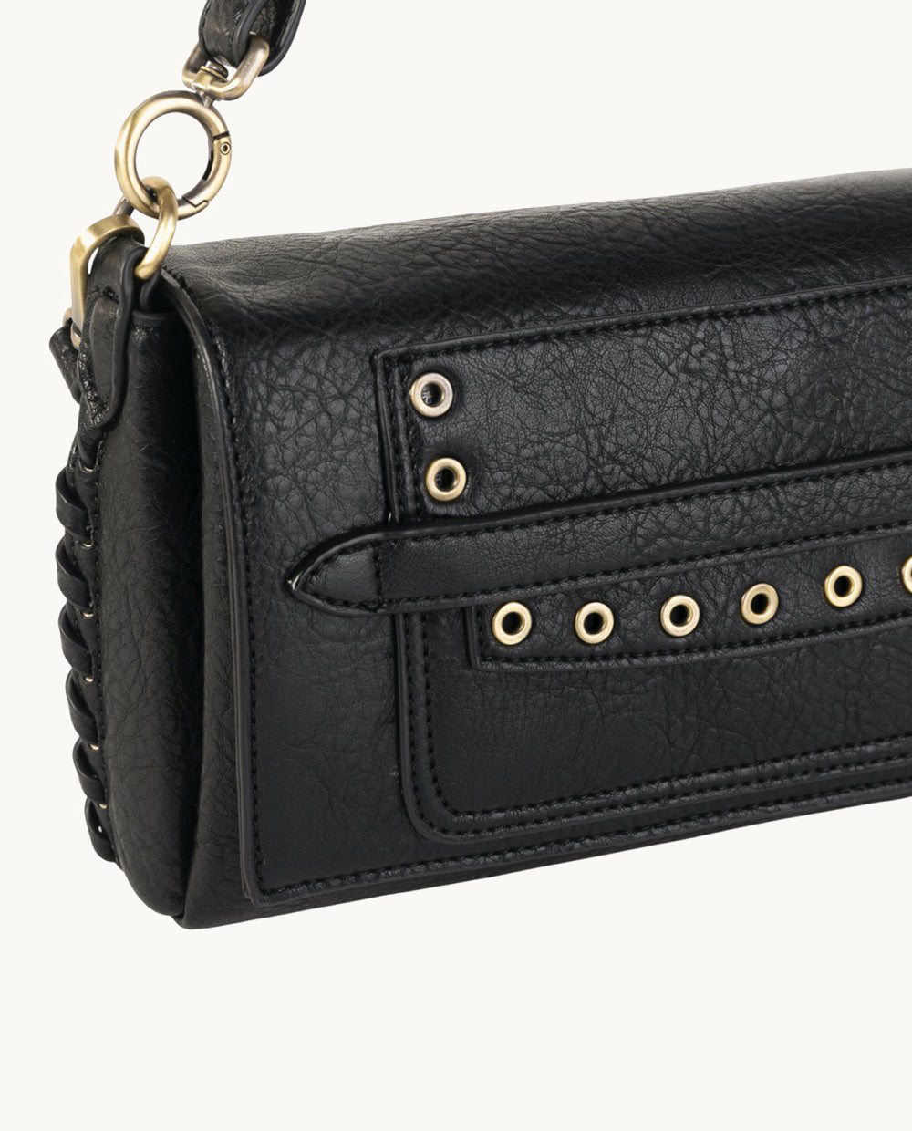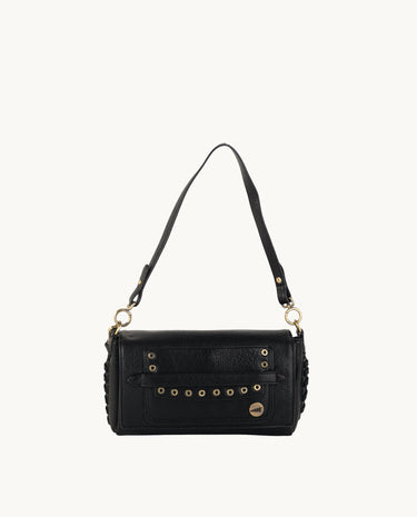 La bandolera URBAN ONA está confeccionada en piel sintética negra, lo que le otorga un aspecto elegante y moderno. Su diseño incluye detalles en dorado, como los remaches y los herrajes, que añaden un toque de sofisticación.