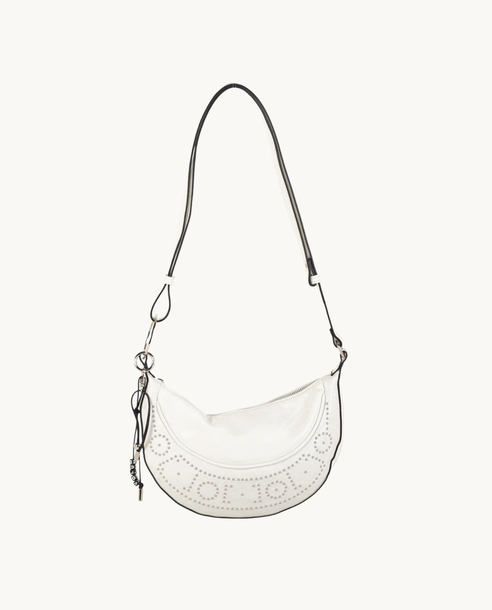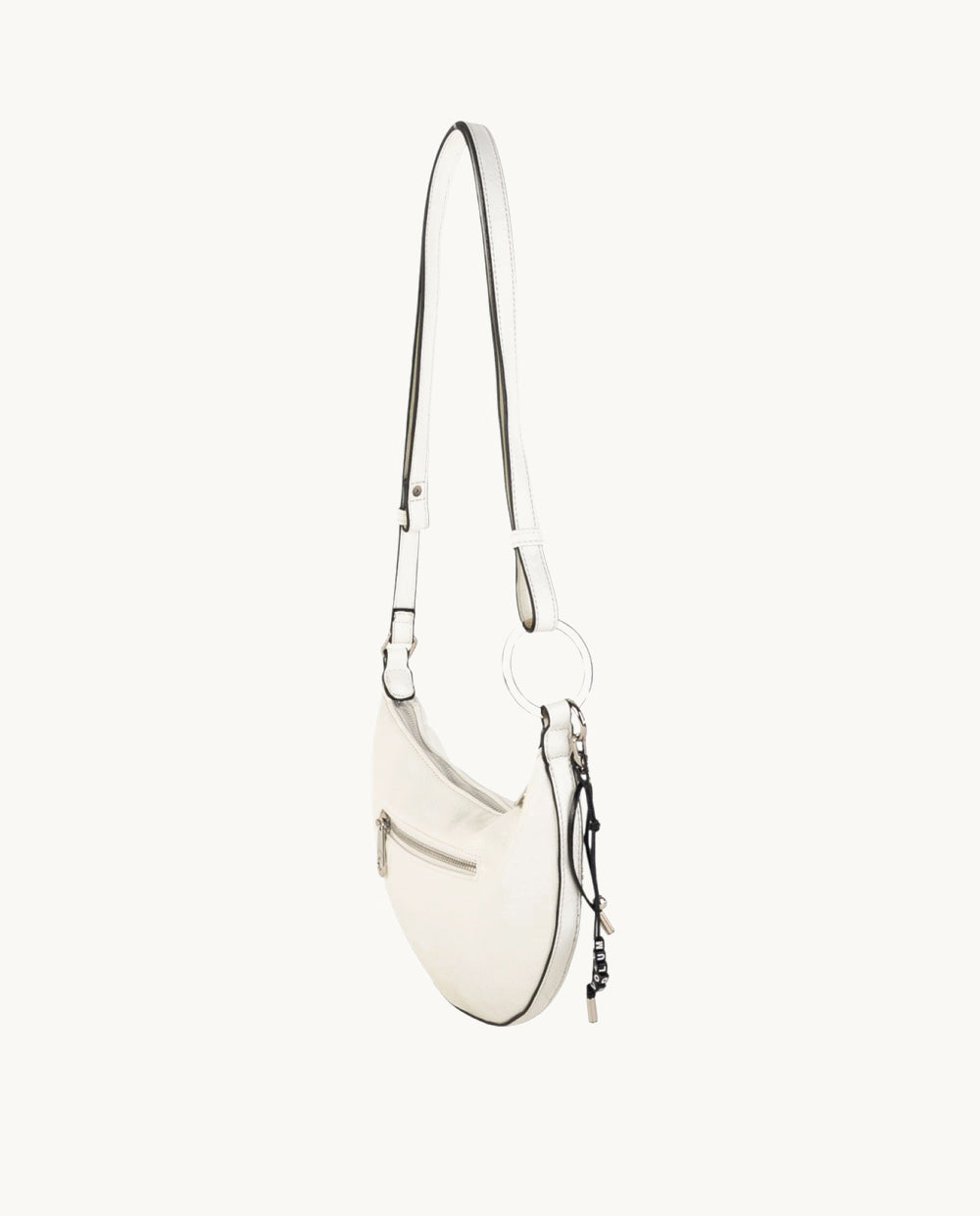 La bandolera URBAN PIA está confeccionada en piel sintética blanca, lo que le otorga un aspecto elegante y moderno. Su diseño curvilíneo, que recuerda a una media luna, la hace muy atractiva y fácil de llevar.