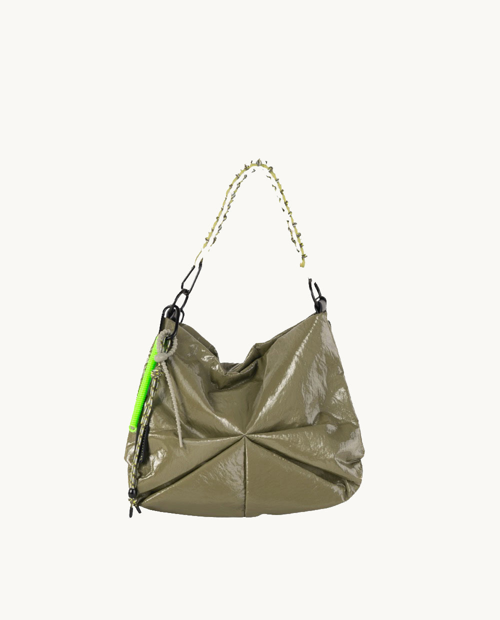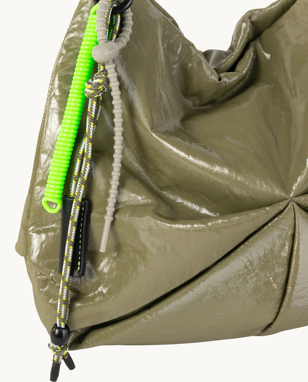 La forme légèrement arrondie, avec des plis subtils, ajoute une touche de style unique. De plus, les détails en vert fluo, notamment la sangle et les cordons, apportent une note de modernité et de dynamisme à l'ensemble.