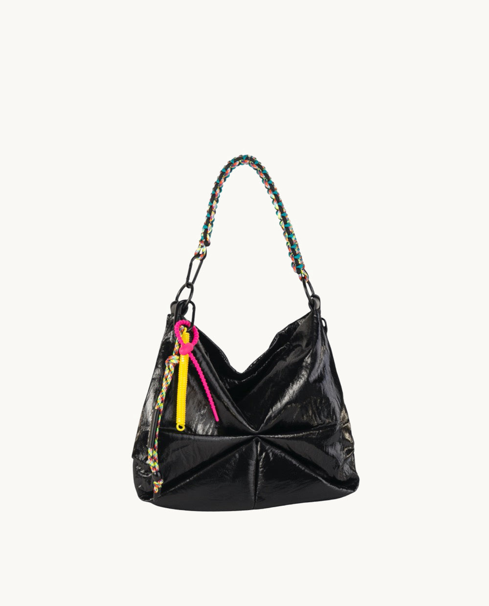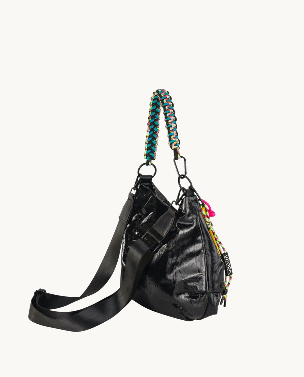 La bandolera cuenta con un asa trenzada en colores vibrantes como el azul, amarillo y rosa, que contrasta con el negro del nylon, aportando un aire divertido y juvenil. Además, incluye una correa ajustable que permite llevarla de diferentes maneras, ya sea al hombro o cruzada.