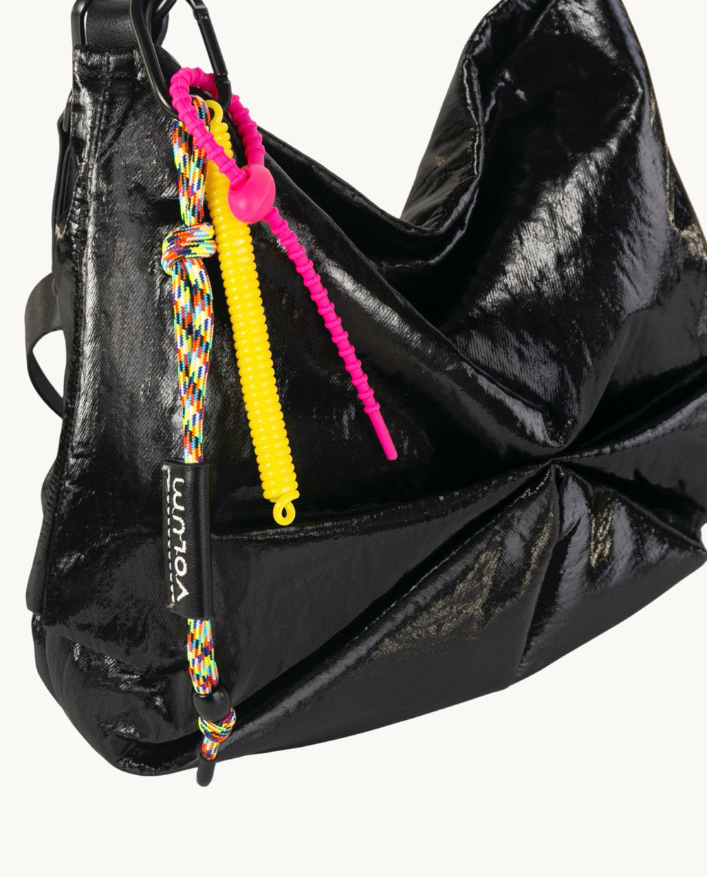 Entre los detalles destacados, se encuentran elementos en colores neón, como un colgante que añade un toque de color y personalidad. Estos detalles decorativos hacen que la bolsa sea única y llamativa.