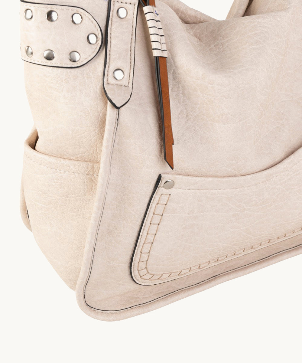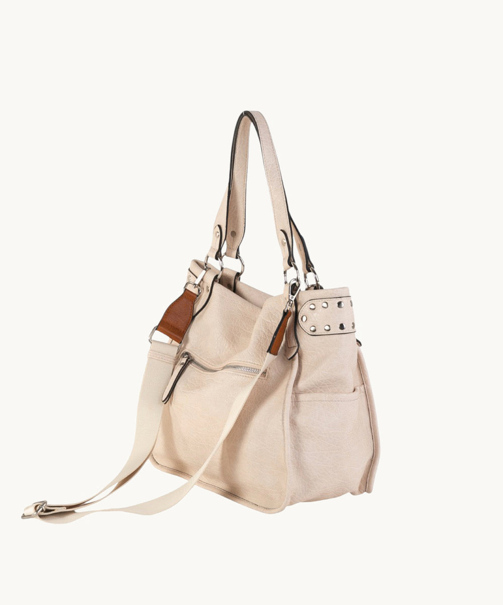 - Adornos metálicos en forma de remaches en las asas, que añaden un toque de estilo.
