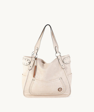 Este modelo puede estar disponible en diferentes colores, aunque el marfil es el más destacado en las imágenes. La combinación de texturas y detalles metálicos le da un carácter distintivo, perfecto para quienes buscan un accesorio versátil y chic.